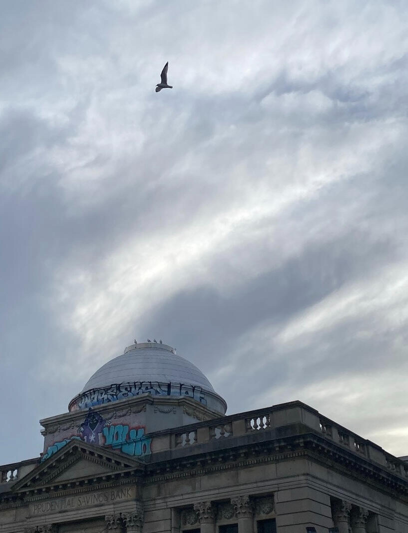 Buildings in the downtown area are pale brick or vinyl siding—white or blue, flaking off. Chipped murals with smiling faces of community members fall off the walls, too. On the main street mural, a young girl smiles mid-pirouette. A chip revealing the original grey color of the building is where her tooth was. She was the muralist's daughter. I got to know him. He was haunted by her early passing. He’d call me late and ask if everything was okay. He has a tattoo of a bird on the area between the pointer finger and thumb. I spent many nights in the basement with dust all over the floor, hanging out with the muralist. Ash fell off our mouths. His wails echoed around the unfinished studio cave, which was filled with his daughter's image. She was painted all over town, in many roles: ballerina, hawk, and graduating student.