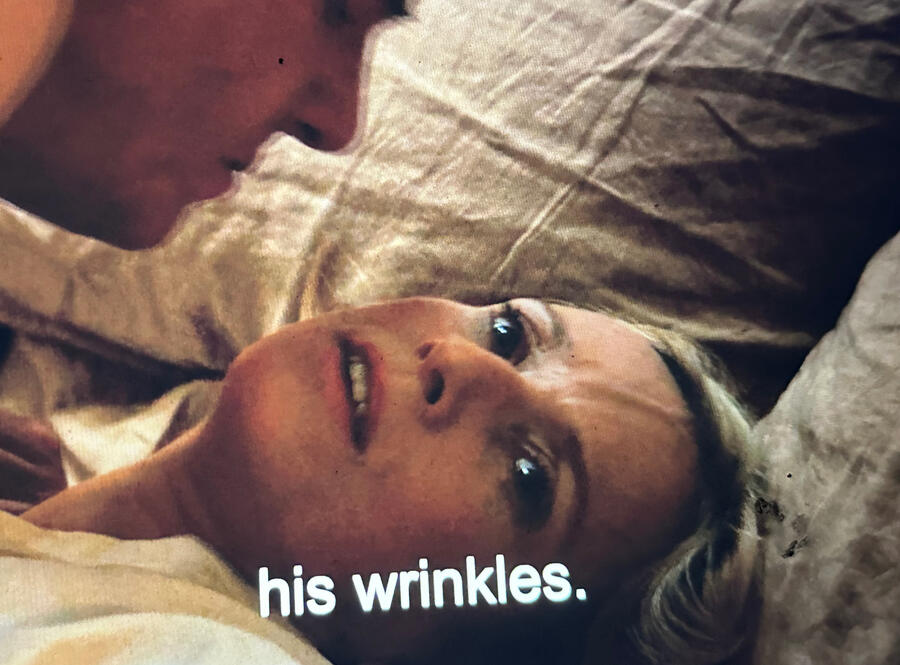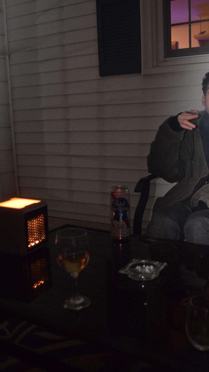 A tucked into serviceable sheets after taking off his puffer and jeans. In the morning, A donned his puffer. The all-male household looked up from its coffee and straightened its postures when D and A left together. On the oceanside walk, A wore a tin man's coat below purple hair. The coat flashed light shapes on the blue sky and sand.M ate chips in the sandstone building at lunch. She placed each chip in her mouth with two glossed fingers. Her lip-glossed mouth was above a mask sling. Flaky salt stuck to the pink gloss. Her legs crossed. D's legs crossed. A eyed M wiping her fingers on a paper napkin, while ocean sounds musicked the room—real and machine-made. A chip lay curved on the floor below A's chair. D looked out a window behind A's chair. D clicked his pen; A clicked his pen; M clicked her pen. A's coat was ahead of the window, pressed into the plastic chair back. D peeled his sunburn. M picked chip crumbs off her lipstick: she pressed her finger on the lip and smeared its edge. Her fingertip was pink with crumbs landed in the residue. M wiped her finger on a paper napkin. And then rubbed her hands over her jeans, up and down. The napkin was a crumple on the floor: a white flower with a pink bloom. It touched A's coat sleeve trailing on the floor. A pinched his earring and rotated his bracelet. Arms stretched up with interlocked hands, and chins pointed at the window.Back home, lobsters sat on each other and clicked. They tapped the fruit drawer's rectangular monocle, while the men ate separately, except for D and A, who ate together. Across from each other on the twin beds, the two's pressed knees pointed in different directions. Plates on laps. A's purple hair was neon on the white wall and his eyebrow had a piercing, whereas D had a shaved head.There would be Thanksgiving here: the five men at the table staring down, while M had hers in the separate place. D used the silent one's dandruff shampoo.The sun looked through the shoegaze. Cars and bikes looked smoky and voices outside were quiet. Like a crank D's arm lifted his hand to his mouth to insert a spoon.--A gray head appeared on the sea. Saran water undulated with the moon's pull.--Plates from yesterday were on the floor still, and the men moved the plates to the dishwasher.