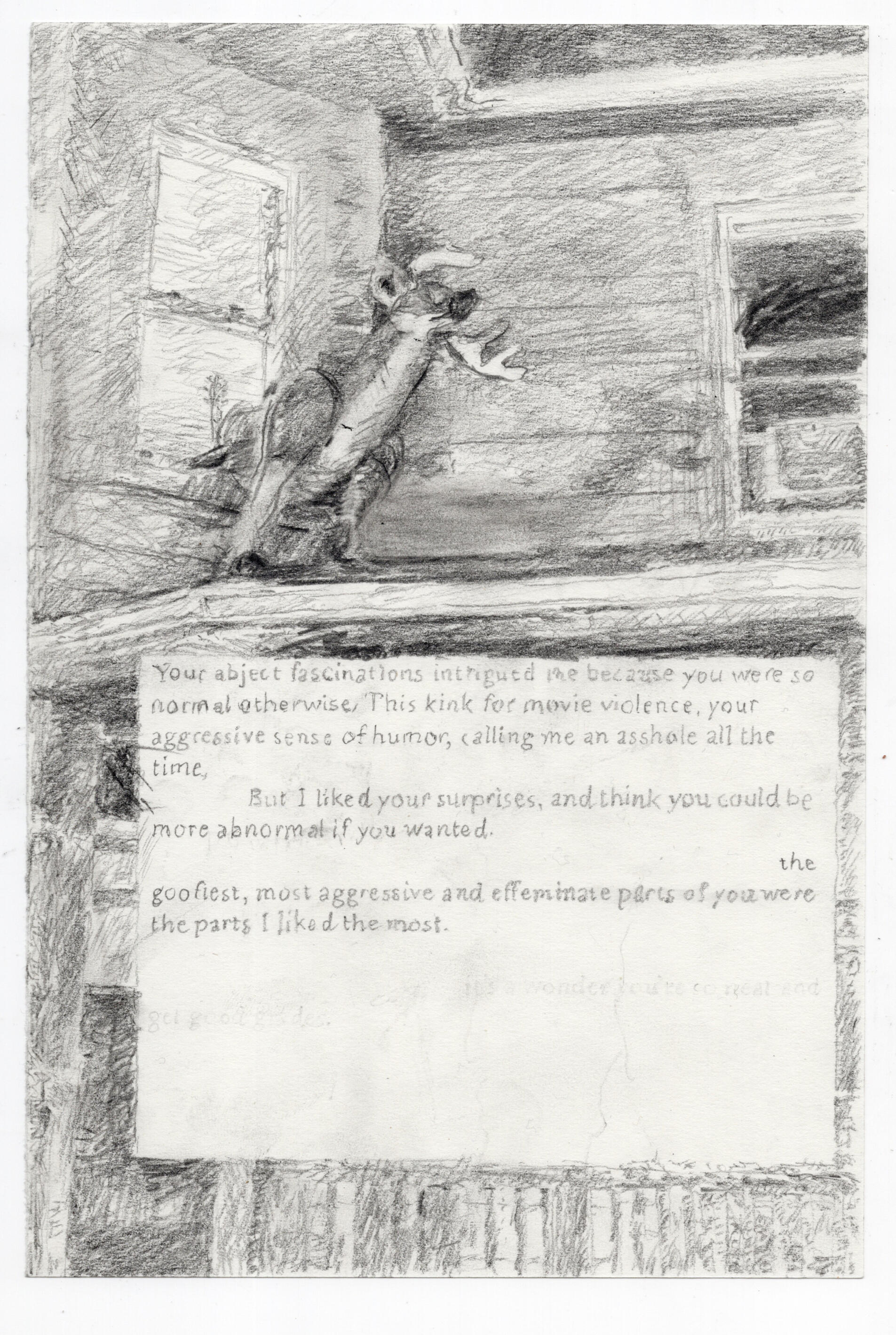 He orders the car from the pier. In the backseat, I pinch the vertebrae on his neck, going up and down as he watches. I picture the architect slicing me up, and dragging me out to the river. At the elevator door, a couple smiles with a groomed dog on a leash. The bellhops are smiling too. The architect relaxes on the couch, with hotel art above his head: Franz Kline lookalikes, the smaller framed drawings are curvier and more symmetrical than Kline. The architect asks why the classes don’t interact in New York. I look out at the castle dispersed: all its turrets skyscrapers with fireworks above. He says: This is like the bombs from my childhood. I adjust the couch cushions to be at a slight angle and dim the lights. I read him Wojnarowicz smut. He talks about a blonde European noble with a desperate face. I talk about my ex, who picked out a camouflage-thermos. He ate a corndog coated in vinegar cheese dust, and wiped the dust on his pants, going back and forth like a grater. I dipped the brush in turpentine, then dragged it across his face.In the car, I have my hand on the architect's leg. The buildings are gravestones taffy-pulled by the architect on a y-axis.Two planes overlap overhead. One leaves a trail and the other keeps going. Though the one plane's trail is more visible now, it will disappear. The architect will build skyscrapers and mausoleums across the world.The first night in the hotel, I knocked on the wall: no one can hear us.He said: exactly.You're making me nervous.Why?Your eyes.My eyes?They're so cold and electronic.You think I am a robot here to kill you?No, but you have a scariness about you: an intimidating quality I can't understand.And you like this? He rubbed my arm.I moved to the bed edge and looked at myself in the mirror.--Are you going to Uber, or take the train?The wall in my room turns into the hotel window. Through the window, I can see a grey tower the architect builds. It has a golden cap. The cap points down instead of up. I stand by the water, and look through the skyline to see his building. The skyscraper-in-progress is thin and surrounded by cranes. It hasn't been covered in glass yet. The upside-down gold head is not on there yet. The architect said: it reflects the people. That hotel was a fortress. The turret architect is a pragmatist. He dislikes the skyline he adds to, yet he would rather be an architect than a builder.I am flat on my floor bed looking up at the ceiling. I am flexing my toes and rubbing my ankles together, looking at the blue jacket the ex wore in the rain to Maryland.Assessing our differences, the architect said: you see darkness; I see light. In my dark room, I know every object. The blue coat my ex wore on a cobblestone bridge. We kissed for the camera. In the car, headlights and taillights shone on wheat like four rays. Your dad's car, will he care you took it? We watched TV: Jerry Springer and Million Dollar Listing reruns on Bravo, while I drank blue beer and he sat narcotized. Snow fell down the window, surrounded in oak paneling. Passed out drunk on the bed, while the cats ran scrabble. Do it again tomorrow. Drink the cat piss. I was happy. Scrabble game on the floor. Cheap champagne, like we'd just bought a house. Lying in the architect's hotel room, I asked if I was there to make him less lonely. He said: yes, but you're the one I called. Not phrased like this, not so blunt. The architect is a shirt with an invisible seam. On a decrepit pier, the architect told me I reminded him of it. Whereas, I am more like the other pier. He pointed at a distant, more sleek pier.The mountains roll past my eyes. The car heads down the mountain and pitches off the road to sail in reverse to the moon. I will miss the chipped wall. Units filter smog. Windows tint the sunlight. Thick walls create the impression of safety, and silence. Height creates the illusion of disconnect from the low-streets for the buyer or renter.