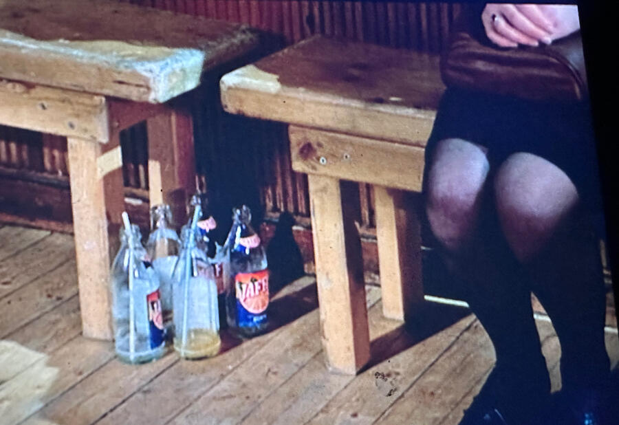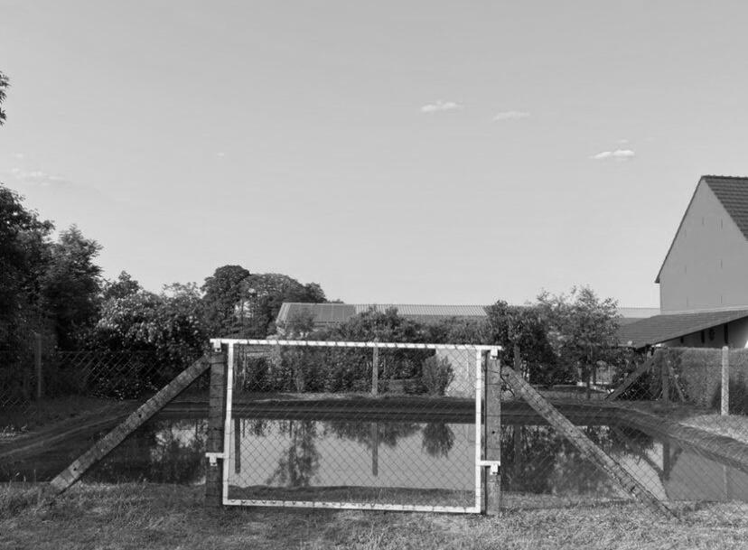 A glass door with an orchid Fathead. A garage door has its door removed, and in place of the door are wood planks surrounding a hovering jeep tail. A white pug sits statuesque in a lawn pot on a sidewalk square before a factory, like an altar. The 16:9 images are flat on my phone with enhanced color and contrast.Three spinners: pinwheels, farm machines, and turbines. Pinwheels are planted in the lawn next to farm machines with spinning blades on metal circles. I sit in a hooded bench, raised high for hunters to aim at far deer. A bullet train traces a long line from my right periphery to my left. The bullet train announces itself with a sailing sound. A nine-petaled blue flower is next to a hot rail.The sky is orange above hay cylinders and blonde children, who played hopscotch outside a white pillared building near the Lidl we visit once per week. Exercise machines are lonely next to slumped medieval houses, made of stone and x-ed by black planks close to the eyeglass store. Halved buildings rot next to new ones. Chairs sit on sagging floors suspended above a people-less street.“Basket” is scrawled on a checkpoint wall. “Basket” is painted over a castle mural.Human-shaped grain sacks are dressed in military uniforms and posed in lawn panoramas or on fire trucks, slumped drunk, or holding limp phallic hoses, ineffectively putting out forest fires in former East Germany.In the quiet car, the Danish woman says, my mother was an East German.Holes break up a flat wall with a sunlight shape on it. The sunlight shape moves across the concrete and turns from rectangle to rhombus on my neighbor's house.I bike to a nearby hunting lodge. I’m taking photos of a mirrored gazebo. Two women are kissing inside, and look scared to see me. I apologize in German. Two women kiss with a military parade the next town over. Pennsylvania is not dissimilar: trees, militaria, and private queerness.The landscape is an archive erasing. Stone stubs with faint names appear like spawn. A low field is an empty cube cut-out with cornstalk hair on the bottom plane.Tire piles are black snakes wriggling on steamrolled trees.The turbines are visible, always, turning steadily in the sky.Losing it, I mutter while clutching the tire-printed handlebars, and blow smoke over my shoulder. I arrive at the gun tower. A stout man wants to use the gun tower, so I let him.The sky has some slate in it. I see the slate in between black trees. The ground is black too, like space. I see two headlights like star trails on the earth. I trip over a log and sink my teeth into a bush.Rail-thin men riding bikes frown, and I quicken my bike pace. I go fast down a hill next to an RV lot. I go faster while filming the RVs, which blur into a white sail.Back close to the yellow house, I see my turbine friends again. The turbines are as wide as the yellow house, where greying apples spill behind a window from a bin.I slice cucumbers at the window. A military truck drives past with a sediment hill making a humpback.The train comes again.My neighbor was an Israeli feminist who gave me militant Acker books. She invited me to watch Black Mirror and we watched it without speaking. Townspeople gawked her trans wife who bowed her head buying groceries. A man smokes outside the window. The train appears every hour. He did not speak, though he was only twenty feet away. He sat in the chair in front of the grey building. I saw him there every day.I lay down in the grass and say "AAHHHG" into it.I spin around and lie down in the steamrolled field. A white van passed by earlier. I’m the only person for miles, unless a hunter sneaks up. I spin around while the turbines, pinwheels, and tractors spin. We are present-tense and absence.The train climbs off the ground, arching over the RVs on a brown-brick structure flying up from the water.A rubber horse lies flat next to a pinwheel. I drag flower pictograms over the image with my finger. At last, only its eye is visible, and it resembles a human eye overlapping my own. It resembles my iPhone lens. I filter the sacred.