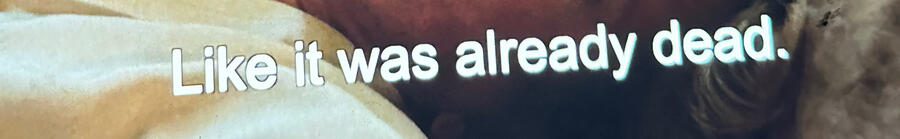 Greys and blues and rotten violets. I want to be with the you that doesn’t have disdain for me. You convinced your friends to disdain me; I felt the interrogating looks, and you confirmed they disdained me. Chop my hair off, and delete every image of us. The I that exists is the typing I.Closed-eye hallucinations of you, you hover above me with a smile stretched wide over a skeleton. The fantasy decayed in real-time. The smiling face turned dotted and static.I am still posted on your Instagram. I am the cold dead-eyed puppy hanging in a photograph on your wall. I am preserved for you and others to see in my happiest state, with a wagging tail. Delirious in the windowless room, I move to the light-filled kitchen to cook pasta.I tried to mirror your behavior by one-upping you the way you do with me. I wanted to demonstrate to you how you act to me--show and tell. It led to us both acting nice. I add hurried strokes to paintings, that coffin them, casket you. They are paintings of you. Empty streets remind me how empty streets are without you. Big eye murals stare at me. A rat smacks into my foot. Quirky coffee shops remind me of every place we never went and did. We didn't fight at Nook; we fought later that day when you kept painting my dirty studio floors white even though I said not to. I'm doing this for you, you said. I said, I'm telling you not to. I am going on a date with the guy I was seeing when I first met you. He has black lines tattooed on his ears and recommended Acid Communism.Your eyes will watch us make out on the ceiling. Not yours, Yours. You know who you are and I hope you die without adornment very soon.