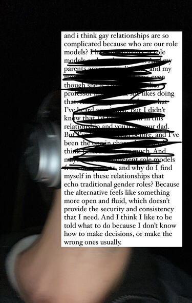 I wear a masc-normative mask for navigation ease, even though I am queer.I'm not claiming to speak for anyone, so much paranoia in the air, and this thought results from the culture of critique and competition, to advance in an American society that kills its losers off, "spiritually," or physically, "for New York City is a very expensive metropolitan area," and America is expensive too (Acker 86). The child is killed by the organization coach.Halberstam writes: "when the Sex Pistols spat in the face of English provincialism and called themselves 'the flowers in the dustbin,' when they associated themselves with the trash and debris of polite society, they launched their poison into the human," and became politically necessary rather than cynical for its own sake, or pure negation and defensiveness (172).Halberstam accuses Edelman's definition of queerness as not as being too hopeless (172).I don't want to be hopeless. Can we be punk still? In 1990, Kathy Acker wrote: "I searched for younger or more radical work or just something other than stock. But the New York art world seemed to have closed its ranks: the old community in which an underground gradually became commercial has disintegrated into a market whose share-holders, frightened, are determined to take no more chances" (86).Why do we fake revelation, instead of admitting confusion? What am I trying to do here?Reckon with queer erasure, and the irrelevance of queer theory to M-G- UXA.Everything I know and am good at is useless to Corp.The call-and-answer format/ voice split is the schismatic culture manifested in the individual, which requires we break into performed and private parts: secret and public voices, policed by ideological correctness and controlled by the bourgeois leaders. I am poor and powerless. There is no freedom of speech. There is no freedom of expression if dependent on an economy.Italics insert conflict. You are reading the breakdown of an essay and the ideological frameworks it applies to itself, which is what queer art is: uncertainty in itself as counter to normative forms of knowing, mastery, and "genius," which I am not.CUT UP 1: Dumpling caught in my throat. I gulp. Fork against the paper pulp, and white paper pills appear. The beef got caught in their teeth. Blondie and I are out for dumplings, in Corp's neighborhood. Somersault across my plate. What? Just say. With care, I scrape the dumplings into the trash hole. Not enough for me. Don't text me for twelve hours. Tired from working, and then at work. Blame me sitting here and trying to have a nice fucking night with you. He says: I don't know what to tell you. Friends at tech jobs and start-ups, and with the corpses eating Chinese food around a marble island. Appliances for self-improvement, Use and disuse. Unuse. Free time is: be free. Ditched Corp, disgusted wasn't impressed tormented, unhappy. disposition. Untrue, sip my Heineken. happier alone. dead people I ate dumplings with, cupid statue Corpses. Cupid return to Rome. Blondie smiles & turns to me. Drives me to Queens flirt with other guys (I tell him: I might flirt with other guys). Glasses I liked, knock-offs. Prada glasses on the subway. Said goodbye. Nice laugh. Same frames, demeanor is different. Funny car ride. sullen, knees to my chin. I might flirt with other guys. Graduation, had to leave. always sad. hateful. successful. with you. Let's move out of the city to a cheap countryside. I can't do that. you can, you don't want to. He turns the wheel, says nothing. Hand on his neck like a claw and steer his head. Car in park. I love you. I love you too. We can work this out.CUT UP 2: sxicidal document for whiteness; is queerness good? useful to the empire? theory OBSOLETE? low status. ACADEMIC TONE: IS QUEER INTELLECT OBSOLETE? Is earnestness weakness, or effeminate? IS WEAKNESS ANTI-FASCIST? (...) INTELLECT OBSOLETE? Is earnestness weakness, or effeminate? IS WEAKNESS ANTI-FASCIST? AMATEUR AND NON. called cruel art: constraints of REDACTION. Convolution CLIENTELE. CLIENTELE, LUXURY REDACT OBJECT CONTENT. TEXT. not STATE. lament. not; REDACT. CLIENTELE. TEXT. paper. I am not STATE. Dustbin Flower, Psychiatric Material. DO YOU LIKE ME cute, sweet PSYCHIATRIC Pay Buy sex. emotion. human. sweet. humor. Entertainment value EVIL, CAPITAL CAPITOL BODY: ANARCHO-SERFS in NEW YORK die. lament, I am not; WAIF, really, FOE. DIDACT. breakdown DXE. I am weak. SUBTRACT REDACTED and Disturbed MIND, said the LAWYER! sensitive viewer, YOU are beautiful. I am REDACT, stabilized science-fiction. FEEL GOOD escape, what you want to call it? November 15, 2025, said the snarl. GRINCH: ART STATE. STATE ART. dead PEARL. GOOD BOY. redact. CLIENTELE TEXT STATE REDACT. OBSOLETE? AMATEUR NON. LUXURY OBJECT. negative. COIN UNPENITENTIARY, I AM THE GOOD BOY. DEAD BOY, do you like GAY INTIMACY? DEAD BOY, do you like to fuck a dead body? Do you want to fuck the painting? FORMALISM AND LANDSCAPES? ADVANCEMENT OF SELF AND HIGHER INCOME? HIGH INCOME, HIGH INCOME GRAFFITI TEXT IN A REST STOP KINDNESS.CUT UP 3: Hugh Jackman Reminiscence,cyberpunk on a plane, I try to remember K. sex scene more trope pornographic interlude, a male gaze fantasy fruited. Perfect sanitary and well-acted sex with self-aware acting, a raised leg, a dress pulled up from the knee for the camera man, build-up to sex and cut-away Hugh Jackman peels a device off prior sequence memory: device realive her audience witness resurrection. Writing: resurrection and regurgitation; don't know what happened to you, so here you are, a fragment pointless sad masturbatory give it up waste years . evades capture. opposes power kaleidoscopes diaristic, poetic, and academic, blog-writing, non-totality and atonality.recursive. deteriorates in the recursive machine. instability. Instability destabilizes enforcement. cries and eats itself.contradiction. masochistic opposes the sadistic unproductive responses. non-productivity. mutant baby. killing machine splits its citizen