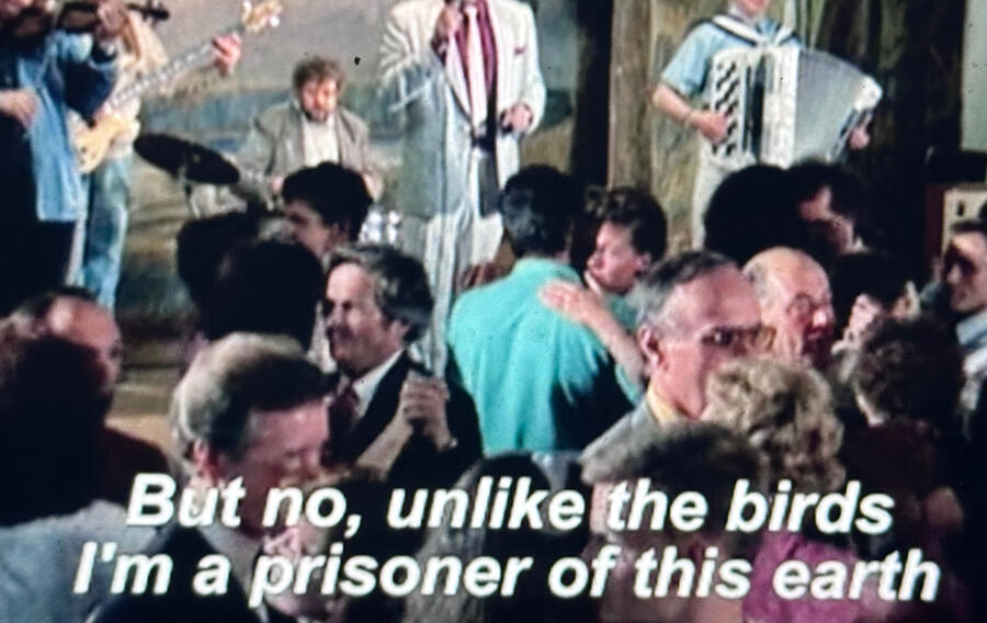 III.I sweep leaves off the floor, I pick up fallen cups. After a night of being sweet, I feel drained.A night with a floating cast of characters, like my coworker Sandy (fake-name) who is hoping to get promoted, go to kink clubs in Berlin, on Xanax. She cooks Gochujang shrimp for dying farmers.I inhabit the consciousness of Sandy, spacing out of my own to join with her headspace. My dog is my girl, my dog makes me happy, lapping blood off my leaky cuts, cleaning me up. If I can work with bandages on my arms, you can too. My shaggy lady keeps me sane. I think I will get out of here someday, but I'd miss my parent-farmers and the wide-open skies and plains, and I'd miss all these cheerful and respectful regulars who tip well. Why am I so sad? I tell men about my anxieties, and they tell me to go outside more. Whatever this problem is, I will get it sorted out. Whatever, this problem is, I will fix it. The workers hate the uppers, use the uppers to work harder. Work harder to fly, go to Disney, work hard to go Soarin' in the clouds, the ladies up there, all the angels up in heaven, we'll get there. Dehumanizing the dehumanized, white Trump supporters all, in all likelihood, who worked extra to save for Disney trips for his wife and kid, works at the Hilton to get a deal on $40 hotel rooms anywhere in the world by Hilton, dream to be a band caterer so she can travel the world, on tour, convert her parents' farm to a horticulture therapy retreat. Ginger with a prison guard husband. She is trying to get him special shoes because he spends so much time standing on the concrete. She was a drug and alcohol counselor at state facilities. Coworker breathes fire, chews tobacco. Coworker who sings karaoke three nights a week, saw him out, red-faced and happy. Nice people, nice to me, with the constituents that I perform sameness and similarity, acting like an echo vessel. The queer is an expert mimic. To soar with a band. To fly through the roof of the dive bar. To wash so many cups that doing so becomes automatic, to turn on a smile in despair, style a Great Clips haircut, I hate that some have to struggle so hard to survive while others spend so frivolously. Trump gave them hope, feel bad, he never meant to do much for them, never was going to, stoked their hatred and stroked their resentment for self-gain.I was attempting in the previous paragraph to inhabit the evil collective-consciousness without identifying or aligning myself with the hateful clan spirit. To pass as one, one can understand one. I am not one, a hater, I was trying to inhabit a hater perspective. Suffering can create hatred. Reduce suffering. Stop caricaturizing evil; evil is nuanced and faceted.To have a Disney daydream, to infinity and beyond. All the valor of hard work, there must be valor in a dead life, a hard life.