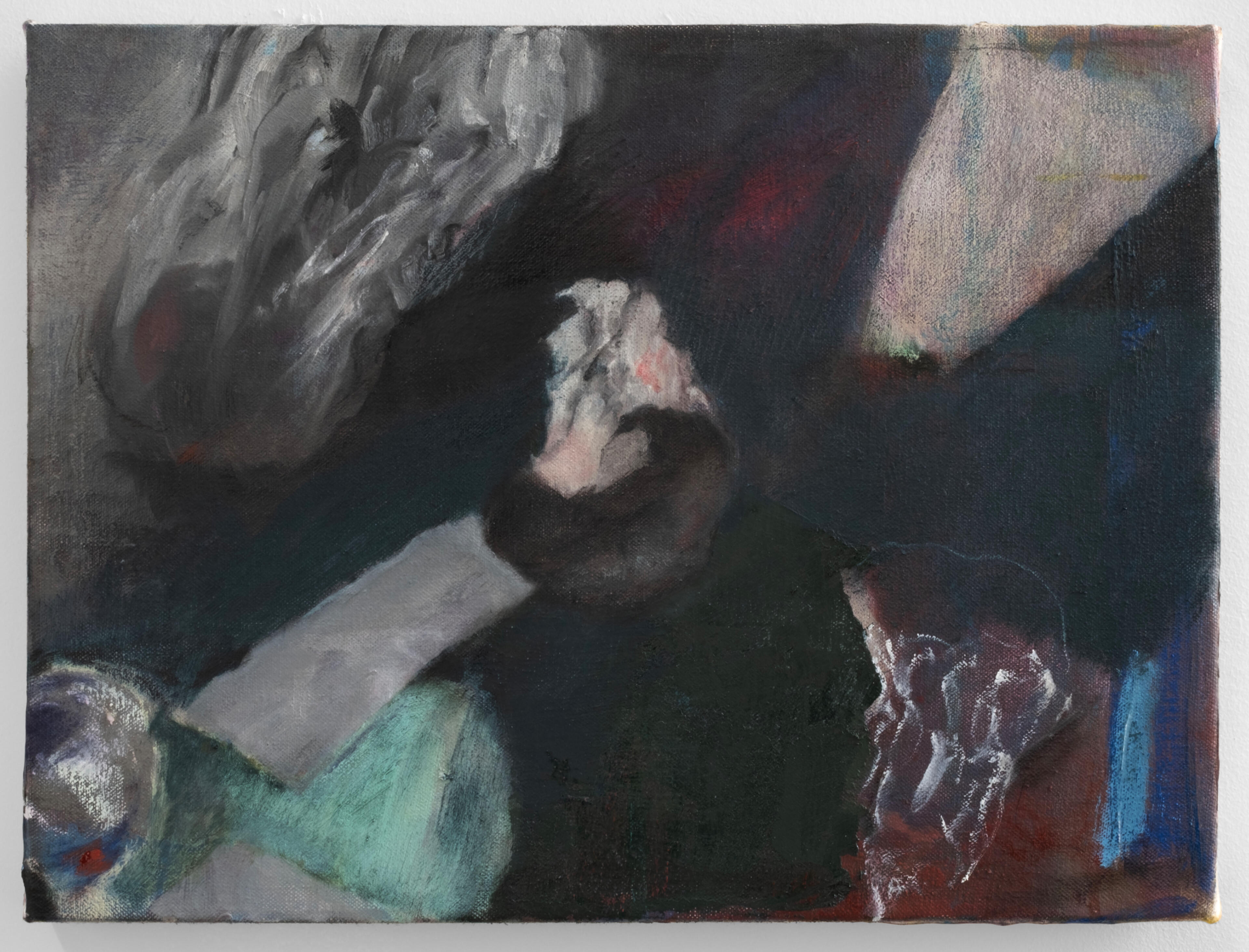 Lost coat tries to drift outside it/ complacency versus defiance, 24 x 36 inches, oil on canvas (work-in-progress)